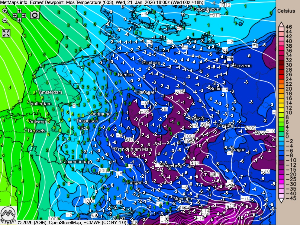 Die Taupunktkarte mit den Lufttemperaturen sowie die Wetterkarte für 18:00 Uhr nach EZMWF: