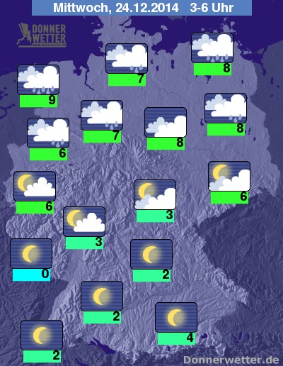 In der Nacht zum Mittwoch bleibt es im Norden weitgehend bedeckt und es fällt auch weiterhin zum Teil langanhaltender und ergiebiger Regen. In der breiten Mitte des Landes ist es verbreitet aufgelockert bis stark bewölkt, jedoch meist trocken. In den südlichen Landesteilen zeigt sich der Himmel oft sternenklar, hier bleibt es dabei natürlich trocken. In der Nordhälfte des Landes weht weiterhin frischer bis starker, in Böen und an der See teils stürmischer Wind. An der Nordsee sind einzelne orkanartige Böen möglich. Die Temperatur sinkt auf 9 Grad in Ostfriesland und bis 0 Grad im Bliesgau.