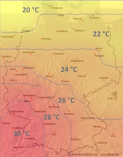 Die Temperaturen erreichen Höchstwerte um 21 bis 23 Grad C an den Küsten und um 26 Grad C im Rheinland.