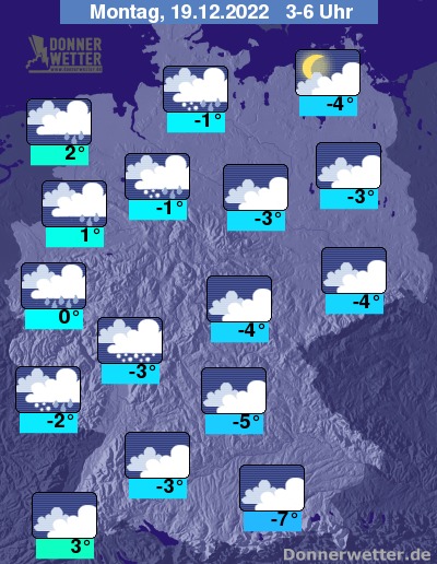 In der Nacht zum Montag ist es bereits landesweit bedeckt und von Westen her setzt Schneefall, Schneeregen und teils gefrierender Regen ein, dabei besteht extreme Glättegefahr! Lediglich in den östlichen Landesteilen bleibt es bis zum Morgen noch weitgehend trocken. Die Temperatur sinkt auf 3 Grad im Breisgau und bis -7 Grad im Berchtesgadener Land.
