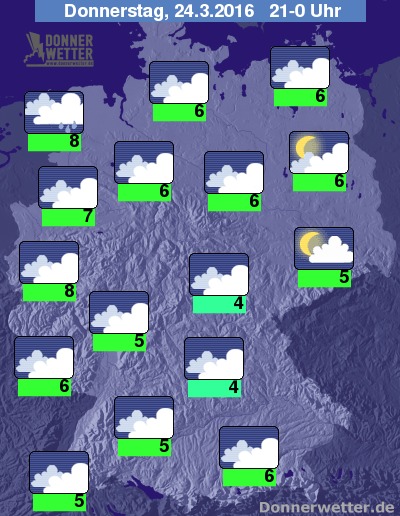 Heute Abend ist der Himmel über Ostdeutschland noch gebietsweise aufgelockert, sonst über dem Bundesgebiet jedoch weitgehend dicht bewölkt. Zunächst zieht im Nordwesten, gegen Mitternacht auch im Norden und Westen zeitweiliger Regen auf, über der Südosthälfte bleibt es weitgehend trocken. Die Abendtemperatur liegt bei 8 Grad in Meppen und um 4 Grad in der Oberpfalz.