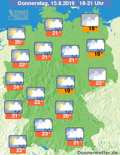 Am frühen Abend bewegen sich die Temperaturen noch zwischen 18 Grad im Ostseeumfeld und nahe 25 Grad in den Ballungsgebieten des Westens.