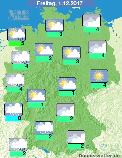 Gebietsweise halten sich dichte Wolken mit etwas Schnee oder Schneeregen, im Tagesverlauf werden die Niederschläge immer seltener. Hier und da schimmert die Sonne durch die Wolkendecke hervor, im Nordwesten und Norden lässt sie sich teilweise auch längere Zeit blicken. Die Höchsttemperaturen liegen meist zwischen 0 und 5 Grad. Im Bergland herrscht leichter Dauerfrost. Der Wind weht meist nur schwach bis mäßig. In der kommenden teils klaren Nacht droht verbreitet leichter bis mäßiger Frost, nur an den Alpen kann es noch etwas schneien.
