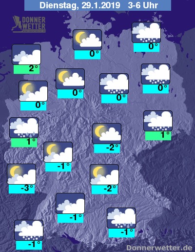 Die Temperaturen erreichen Werte um 2 Grad C in Ostfriesland und um -3 Grad C im Pfälzer Wald.