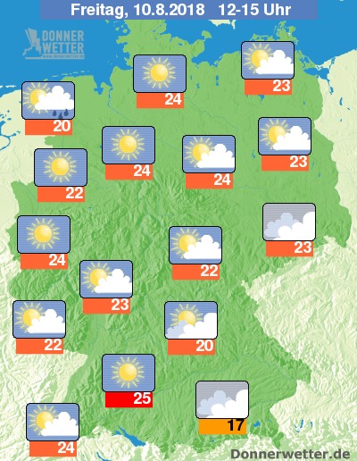 Dabei machen sich die kühleren Luftmassen, die das Tief mit sich gebracht hat, heute landesweit bemerkbar. Die Höchsttemperaturen liegen verbreitet bei Werten um die 25 Grad, an der Nordsee und am Alpenrand werden kaum mehr als 20 Grad erreicht.