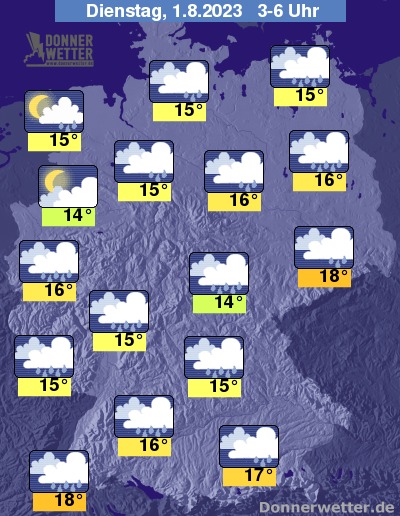 In der kommenden Nacht ziehen überwiegend kompakte Wolken durch und es fällt immer wieder, zum Teil auch länger anhaltender Regen. Die Temperatur sinkt auf 18 Grad in Freiburg und bis 14 Grad in Meppen.
