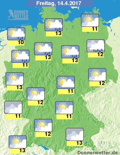 Die Höchstwerte bewegen sich dabei zwischen 10 Grad in Nordseenähe und 13 Grad an Rhein, Donau und Elbe.