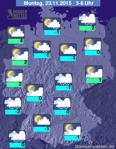 Am Montag zeigt sich über dem Norden und Westen verbreitet die Sonne und es ziehen hier meist nur lockere Wolken durch. Oft stark oder dicht bewölkt bleibt es hingegen über der Südosthälfte des Landes, hier fällt auch zeitweise Regen, Schneeregen oder Schnee mit entsprechenden Glättegefahren. Auflockerungen sind hier jedoch ebenfalls möglich. Die Temperatur steigt auf kalte 1 Grad im Leipziger Land und bis etwa 6 Grad in Emden.