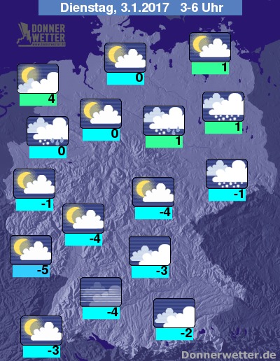 In der Nacht zum Dienstag ziehen von Nordwesten her oft dichte Wolken mit Regen, Schneeregen oder Schnee in den Norden und Osten Deutschlands, dazwischen lockert die Bewölung jedoch auch auf und es bleibt dann trocken. Es besteht oft Glättegefahr! Weiter nach Süden und Westen hin zeigt sich der Himmel überwiegend nur locker bewölkt oder sternenklar, dazu bleibt es trocken. Stellenweise ist Nebel möglich. Die Temperatur sinkt auf 4 Grad an der Nordsee und bis -5 Grad im Saargau.