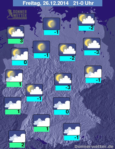 Am Abend klingen auch die Schneefälle im Süden des Landes meist ab, hier und da kann es aber noch leicht schneien. Im übrigen Bundesgebiet zeigen sich zwischen meist lockeren Wolken immer wieder die Sterne und es bleibt trocken. Zeitweise dichtere Wolken ziehen im Westen des Landes auf, aber auch hier bleibt es dabei trocken. Die Abendtemperatur liegt bei 3 Grad an der niederländischen Grenze und um -3 Grad in der Uckermark.