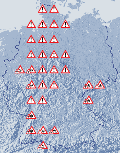 In der kommenden Nacht ziehen häufig dichte Wolken übers Land, die für zeitweilige Schneefälle sorgen, im Nordwesten und Westen fällt zum Teil auch Regen oder Schneeregen. Vor allem über dem Süden und der Landesmitte lockert die Bewölkung auch gebietsweise auf. Es besteht verbreitet Glättegefahr durch Schnee und überfrierende Nässe! Die Temperatur sinkt auf 3 Grad an der Nordseeküste und bis 0 Grad in Dresden und Leipzig. Über der Südwesthälfte des Landes weht ein starker und teils auch stürmischer Wind.
