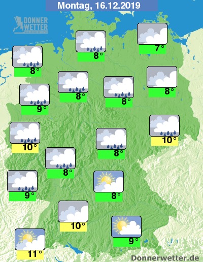 Am Montag ist es verbreitet stark bewölkt oder trüb, dabei fällt vor allem über der breiten Landesmitte, aber auch im Norden und Nordwesten gebietsweise Regen. Im übrigen Bundesgebiet bleibt es weitgehend trocken. Die Temperatur erreicht 7 bis 11 Grad.