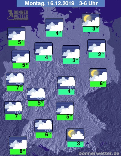 In der Nacht zum Montag bleibt der Himmel über dem Land weitestgehend wolkenverhangen, dazu fällt über der Südhälfte auch gebietsweise Regen, während es weiter nach Norden hin trocken bleibt. Die Temperatur sinkt auf 8 Grad im Breisgau und bis 2 Grad im Berliner Umland.
