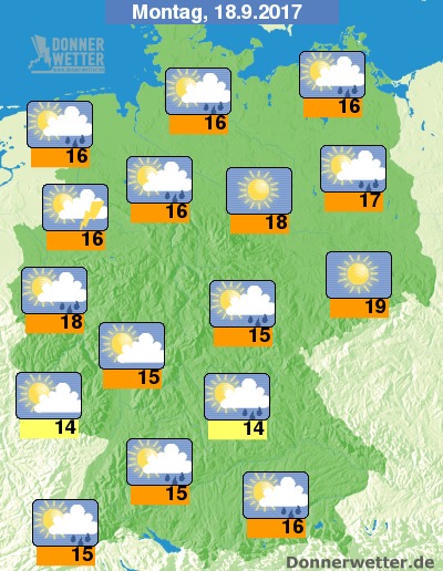 Zum Wochenstart zeigt sich vor allem der Osten Deutschlands oft heiter bis sonnig und zum Großteil trocken, ansonsten gibt es jedoch meist einen Wechsel aus zeitweiligem Sonnenschein und teils dichten Wolken, dabei bilden sich gebietsweise Schauer und örtlich sogar Gewitter. Die Temperatur liegt bei 14 Grad in Mittelfranken und etwa 19 Grad in der Lausitz.