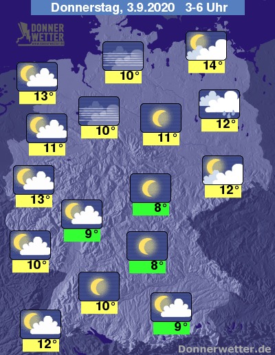 Während der zweiten Nachthälfte kann es insbesondere in Odernhähe noch tröpfeln. Im großen Rest bleibt es teils leicht bewölkt, teils sternenklar. Im Norddeutschen Tiefland kann sich stellenweise Nebel bilden.