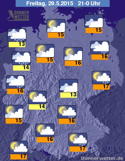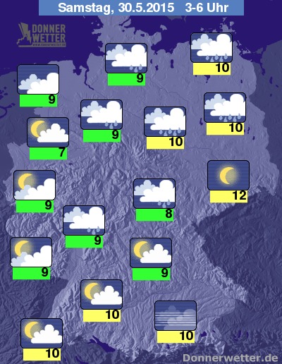 In der Nacht zum Samstag ist es häufig aufgelockert bewölkt, im Westen, im Süden und in Sachsen auch vorübergehend locker bewölkt oder sternenklar, sonst und besonders in Norddeutschland aber auch längere Zeit stark bewölkt, dazu fällt zeitweise Regen. Die Temperatur sinkt auf 12 Grad an der Neiße und bis 7 Grad im Münsterland.