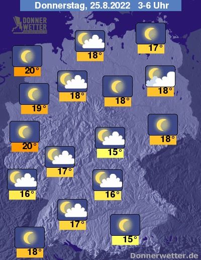 In der Nacht zum Donnerstag zeigt sich der Himmel nur locker bewölkt und oft auch sternenklar. Im Osten hält sich zum Teil auch stärkere Bewölkung, dazu bleibt es trocken. Die Temperatur sinkt auf 20 Grad in Köln und etwa 15 Grad in München.