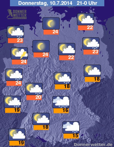 Heute Abend bilden sich bei teils dichten Wolken vor allem vom Nordwesten bis in den Westen und gebietsweise im Osten zeitweise Schauer und Gewitter. Weiter nach Süden fällt bei wechselnder bis starker Bewölkung zeitweise Regen. Freundlich und trocken ist es dagegen in weiten Teilen Norddeutschlands. Die Abendwerte liegen bei 24 Grad in der Kölner Bucht und um 15 Grad am Alpenrand.