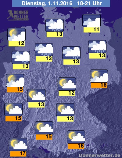 Heute Abend zeigt sich der Himmel über der Südhälfte Deutschlands oft locker bis aufgelockert bewölkt, dazu bleibt es trocken. In den nördlicher gelegenen Landesteilen halten sich dagegen größtenteils dichte Wolken und es fällt zeitweise Regen. Die Temperatur liegt anfangs bei 11 bis 17 Grad. In den Küstenregionen weht ein teils starker bis stürmischer Wind!
