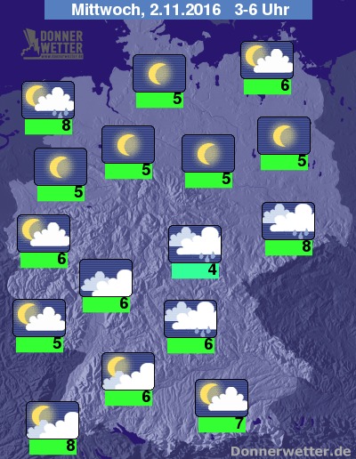 In der Nacht zum Mittwoch bleibt es über Norddeutschland verbreitet sternenklar und trocken. Im Küstenumfeld von Nord- und Ostsee ziehen im Verlauf jedoch wieder dichte Wolken auf, die zum Teil auch kräftige Schauer mit sich bringen. Über der Südhälfte Deutschlands halten sich oft dichte Wolken, diese sorgen von Nordbayern, über Thüringen bis nach Sachsen für gebietsweisen Regen, sonst ist es auch oft aufgelockert bewölkt und dazu meist trocken. Die Temperatur sinkt auf 8 bis 4 Grad.