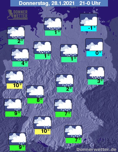 Am Abend fällt im Süden und Westen aus kompakten Schichtwolken zeitweise Regen und Sprühregen. In Verbindung mit dem Tauwetter schwellen Bäche und kleinere Flüsse bereits kräftig an. Im Bereich der Luftmassengrenze im Norden mischen sich in der kälteren Luft Flocken unter die Tropfen, über den nördlichen Mittelgebirgen kann es schneien. Hier droht Glätte. Etwa nordöstlich der Elbe bleibt es trocken und Richtung Ostsee klart der Himmel gelegentlich auf.