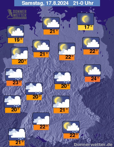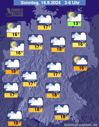 In der Nacht zum Sonntag zeigt sich der Himmel über der Nordhälfte sowie im Südosten meist locker bewölkt oder sternenklar und es bleibt trocken. Von Südwesten greift in der Nacht teils ergiebieger Regen auf den Westen und die mittleren Landesteile über, lokal besteht Starkregengefahr. Auch einzelne Gewitter sind möglich.
