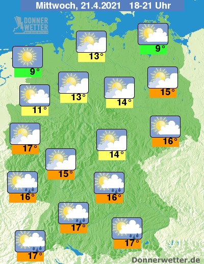 Heute Abend ist es im Süden teils heiter, teils ziehen hier kompakte Wolken durch, dabei bilden sich gebietsweise Schauer und auch örtliche Gewitter. Weiter nach Norden hin ist es wechselnd bis aufgelockert bewölkt und vor allem im Norden auch oft heiter bis sonnig, dabei bleibt es trocken. Die Temperatur liegt bei 9 Grad in Rostock und bis 17 Grad in München.