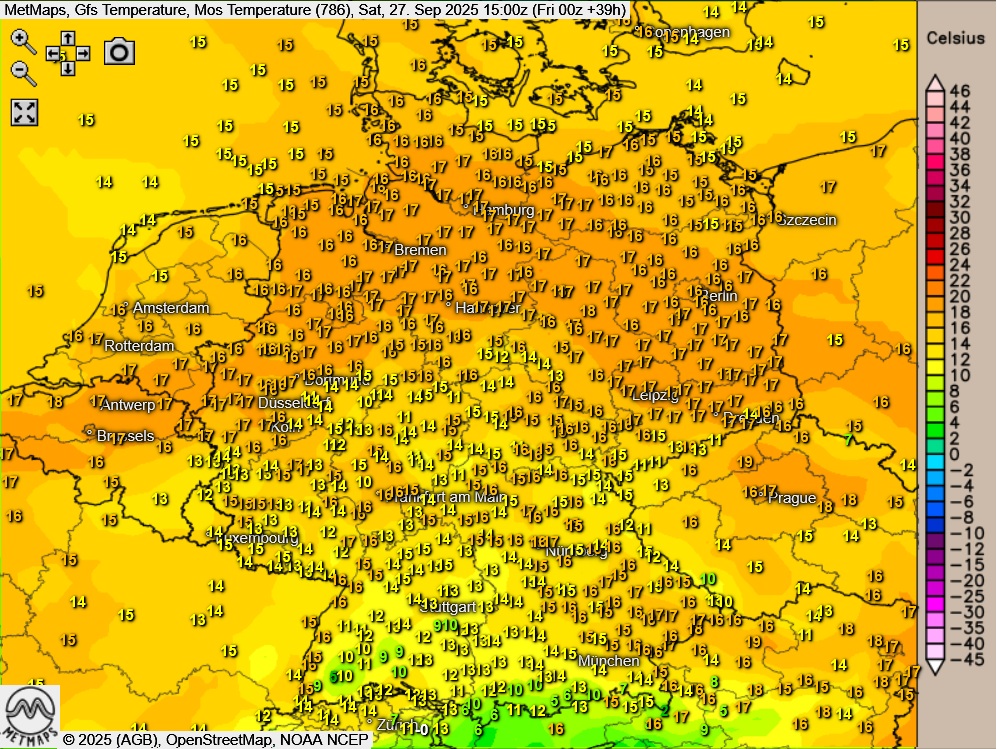Lufttemperaturen Samstagnachmittag (15:00 Uhr) nach GFS