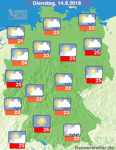 Am Dienstag ist es zeitweise heiter, teils ziehen jedoch dichte Wolken durch, dabei bilden sich gebietsweise Schauer und vereinzelt auch Gewitter. Im Südwesten bleibt es bei weitgehend heiterem Wetter trocken. Die Temperatur steigt auf 21 Grad in Wilhelmshaven und bis 26 Grad in Karlsruhe.
