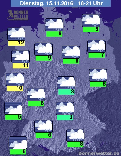 Heute Abend bleibt es bei einer landesweit starken Bewölkung, dabei fällt auch verbreitet, zum Teil längeranhaltender Regen. Die Temperatur liegt bei etwa 3 Grad in Mittelfranken und bis 12 Grad am Niederrhein.