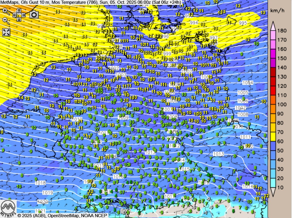 Die Temperatur- und Böenkarte für Sonntagfrüh (06:00 Uhr) sowie die akkumulierten 24-Stunden-Regenmengen am Sonntag nach GFS: