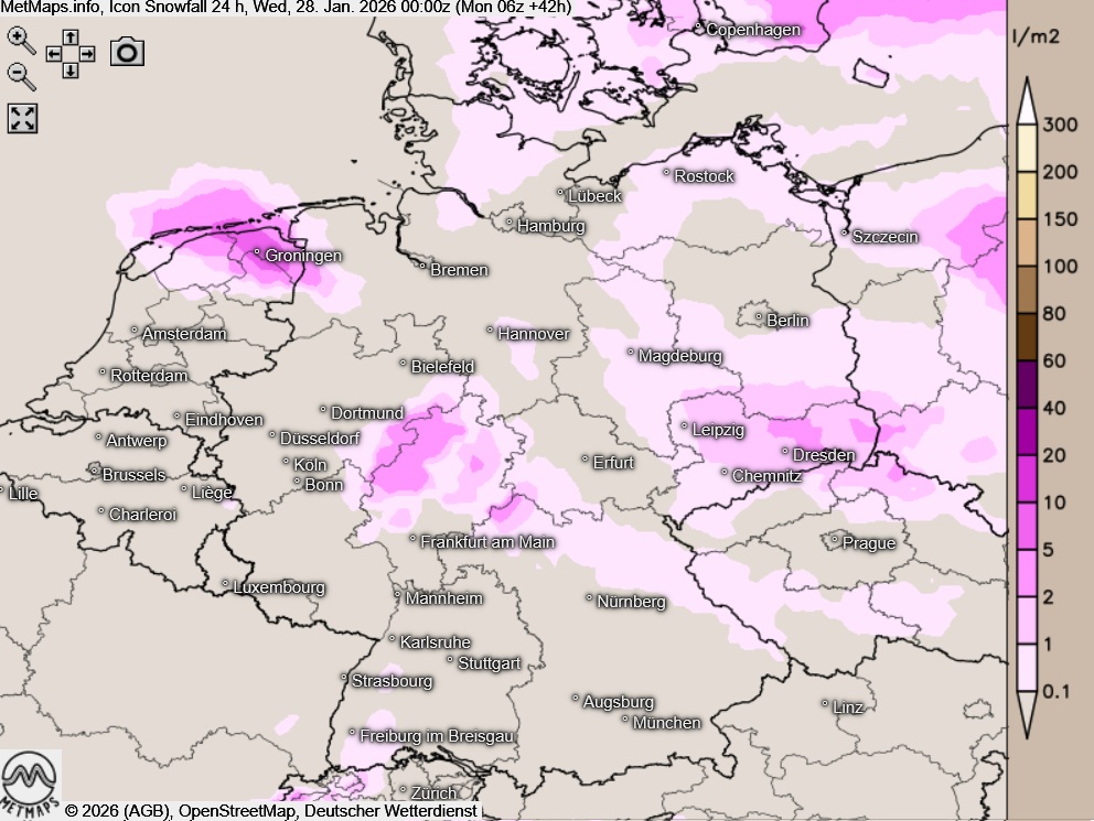 Die Wetter- und Temperaturkarte für Dienstagfrüh (06:00 Uhr) sowie die 24-Stunden-Schneemengen nach ICON: