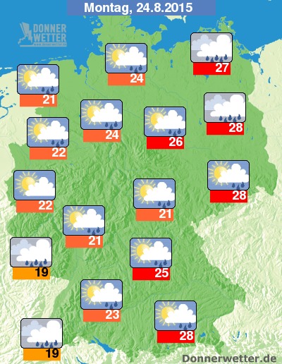 Die Temperaturen erreichen Höchstwerte um 21 Grad C in Ostfriesland und um 28 Grad in Berlin.
