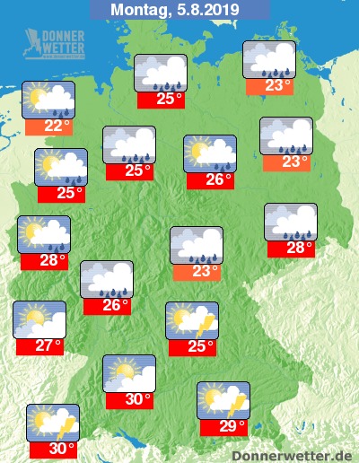 Zum Start in die neue Woche erwarten wir für Deutschland verbreitet stark bewölktes, gebietsweise auch mal etwas aufgelockert bewölktes Wetter, dabei können sich vielerorts Schauer und auch örtliche Gewitter entwickeln. Die Temperatur steigt auf 22 Grad in Cuxhaven und bis 30 Grad in Freiburg.