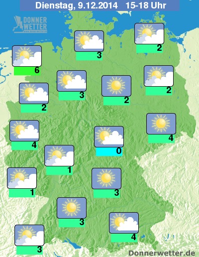 Heute Nachmittag zieht vielerorts lockere bis aufgelockerte Bewölkung durch, zum Teil hält sich aber auch zäher Hochnebel und die Sonne hat es schwer sich einen Weg durch die Wolken zu bahnen, dazu bleibt es verbreitet trocken. Die Temperatur liegt bei 0 Grad im Grabfeld und bis 6 Grad in Ostfriesland. An der Nordsee weht dabei zunehmend frischer bis starker, gegen Abend auch teils stürmischer Wind.