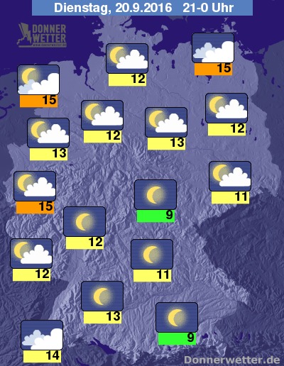 In den späten Abendstunden zeigt sich der Himmel im Norden locker bewölkt, im Süden klart es verbreitet auf. Dichtere Wolken gibt es nur noch entlang der Küsten sowie am Oberrhein.