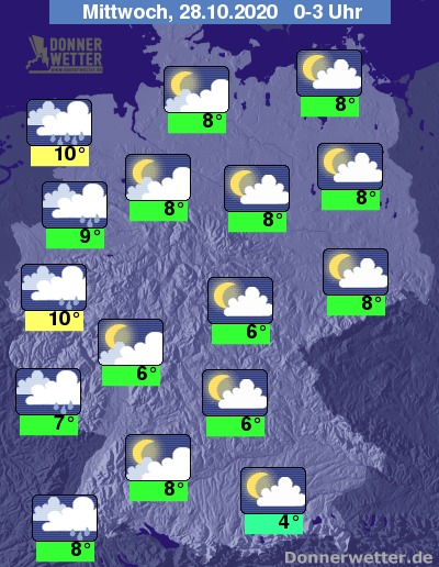 Bis zu den Frühstunden kühlt die Luft auf Werte um 9 bis 4 Grad ab, südlich der Donau kann es zu Bodenfrösten kommen. Im zweistelligen Bereich halten sich die Werte unter den Regenwolken an Niederrhein und Ems auf.