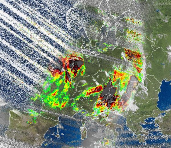 Auf dem Satellitenfoto von heute Morgen sind die sehr kompakten Regenwolken über Benelux und über dem Nordwesten Deutschlands zu erkennen. Hier blieb es auch den Vormittags über und größtenteils auch noch den Nachmittag verbreitet regnerisch und bei Werten zwischen 14 und 18 Grad C ziemlich frisch.