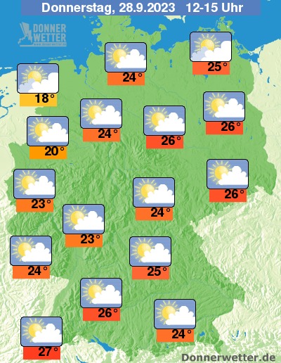 Heute Nachmittag zeigt sich das Wetter überwiegend heiter bis sonnig. Hier und da können aber auch mal mehr Wolken durchziehen, dabei bleibt es aber trocken. Die Temperatur liegt bei 18 Grad an der Nordseeküste und etwa 27 Grad im Oberrheingraben.