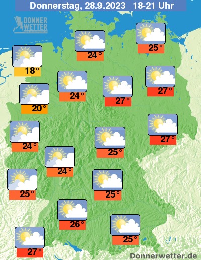 Heute Abend ziehen gebietsweise einige und zum Teil auch dichte Wolken durch. Häufig ist es aber auch heiter. Bei Werten von 18 Grad in Bremerhaven und 27 Grad in Freiburg bleibt es trocken.