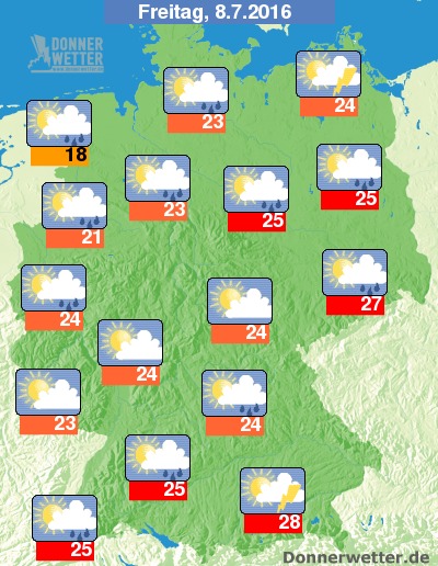 Die Temperaturen erreichen Werte um 21 Grad C an den Küsten und um 28 Grad C am Oberrhein.