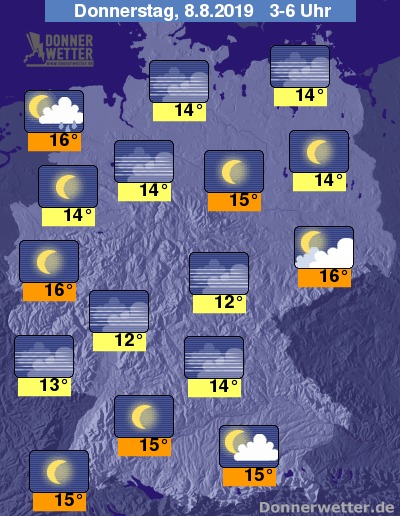 In der kommenden Nacht ist der Himmel meist klar, oft bildet sich auch eine dünne Nebelschicht. Um Das Emsland ziehen ein paar Schauer bei lockerer Bewölkung durch. Auch im Erzgebirge und Oberbayern können lockere bis aufgelockerte Wolken aufziehen. Die Temperaturen fallen auf 14 Grad in Berlin und 15 Grad im Schwarzwald.