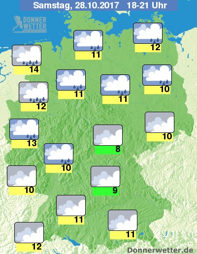 Heute Abend breitet sich der Regen bis etwa über die Nordhälfte der Republik hin aus, weiter nach Süden hin ist es zwar ebenfalls meist stark bewölkt, dabei jedoch trocken. Die Temperatur liegt bei 8 bis 14 Grad. An den deutschen Küsten und auf den norddeutschen Bergen herrscht häufig Sturm, über der Nordhälfte des Landes ist es dazu oft windig, teils auch stürmisch.
