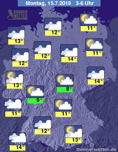 In der folgenden Nacht bilden sich südlich des Mains zunächst noch gebietsweise Schauer, die jedoch bis zum Morgen hin weitgehend abklingen. Über der Nordhälfte des Landes bleibt es stark bewölkt, aber trocken, sonst ist es teils locker, teils auch stärker bewölkt und ebenfalls trocken. Die Temperatur sinkt auf 14 Grad in Magdeburg und bis 8 Grad am Thüringer Wald.