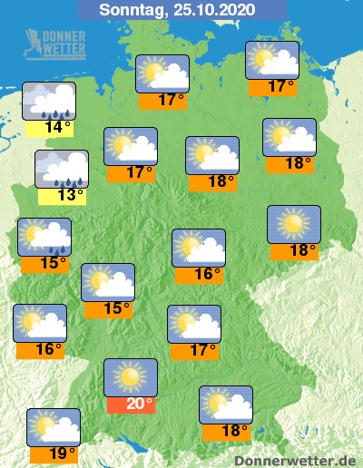Am Sonntag ist es im Westen und Nordwesten stark bewölkt und hier bilden sich mögliche Schauer. Im Rest des Landes ist es hingegen verbreitet heiter bis sonnig. Jedoch nimmt die Bewölkung auch hier im Tagesverlauf tendenziell zu, es bleibt aber trocken. Die Temperatur steigt auf 13 Grad im Münsterland und bis zu 20 Grad in Stuttgart.