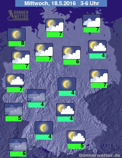 In der Nacht zeigt sich über dem Norden, aber auch über dem Osten Deutschlands eine oft starke, zeitweise aber auch eine aufgelockerte Bewölkung. In den anderen Landesteilen ist der Himmel dagegen größtenteils locker bewölkt oder sternenklar. Bei Tiefstwerten von 8 Grad an der Nordseeküste und etwa 4 Grad in der Oberpfalz bleibt es landesweit trocken. Nur selten bildet sich Nebel oder Dunst.