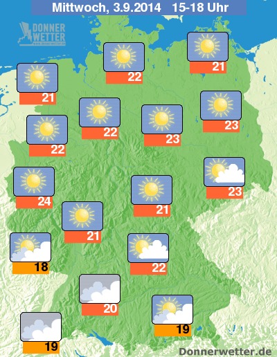 Heute Nachmittag strahlt die Sonne von den Küsten der Nord- und Ostsee bis runter zur Mainlinie. Südlich des Mains ziehen zum Teil dichtere Wolken durch, besonders in Alpennähe und am Schwarzwald halten sich teils dichte Wolken, die da und dort auch ein paar Tropfen bringen können, sonst bleibt es aber trocken. Die Temperatur liegt bei 18 Grad am Haardt und bei 24 Grad in der Kölner Bucht.