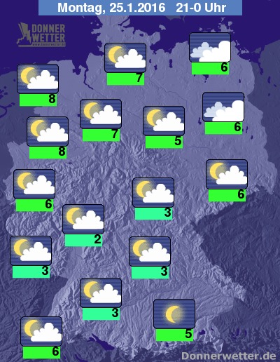 Heute Abend halten sich in Richtung der polnischen Grenze noch meist dichte Wolken, dabei bleibt es aber weitgehend trocken. Im übrigen Bundesgebiet zieht lockere oder aufgelockerte Bewölkung durch, dabei bleibt es trocken, im Süden ist der Himmel oft sternenklar, dabei bleibt es ebenfalls trocken. Die Abendtemperatur liegt bei 8 Grad im Emsland und 2 Grad am Westerwald.