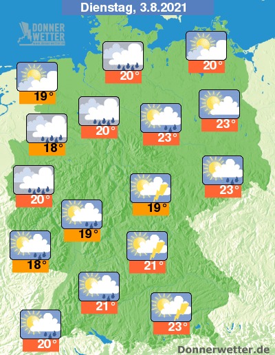 Am Dienstag ist das Wetter meist aufgelockert bis stark bewölkt, hier und da zeigen sich aber auch heitere Abschnitte. Allerdings bilden sich gebietsweise Schauer, örtlich entwickeln sich auch Gewitter. Die Temperatur erreicht 18 Grad im Saargau und bis 23 Grad in Oberbayern.