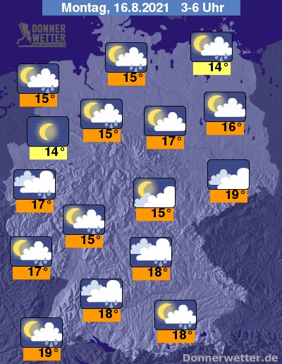 In der bevorstehenden Nacht ziehen zeitweise dichte Wolken durch, dabei können sich einzelne Schauer, selten auch Gewitter bilden. Sonst ist es auch oft locker bis aufgelockert bewölkt, teils auch sternenklar, dazu bleibt es trocken. Die Temperatur sinkt auf 19 Grad im Breisgau und bis 14 Grad im Münsterland.